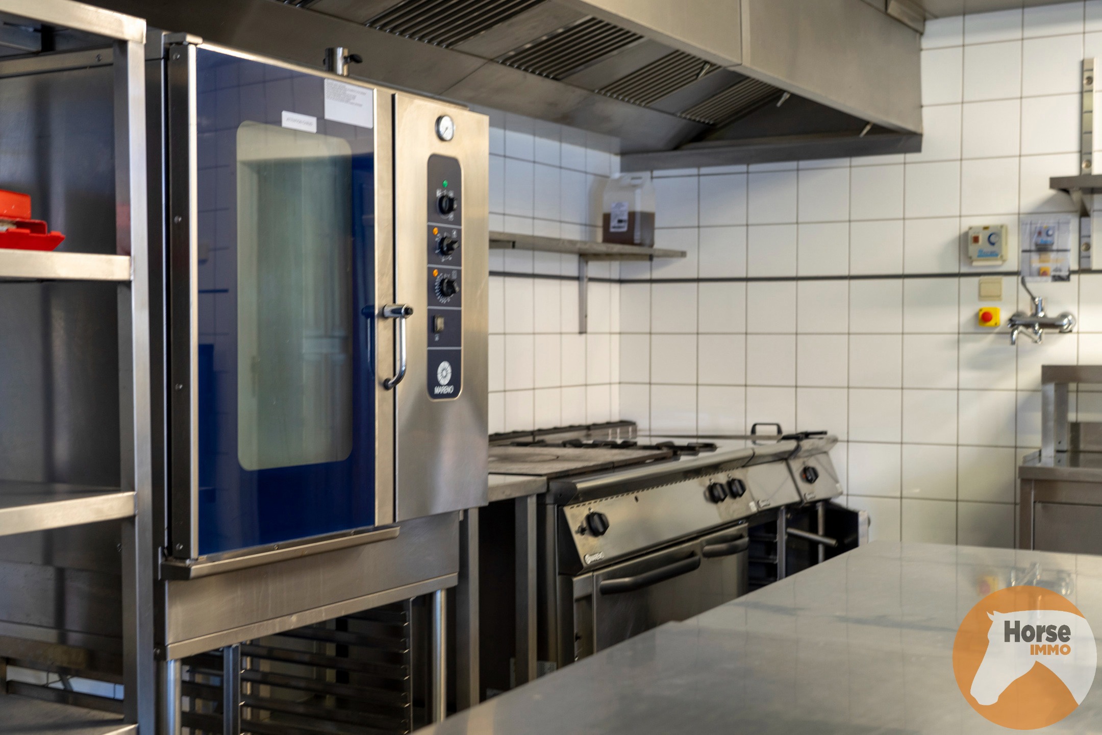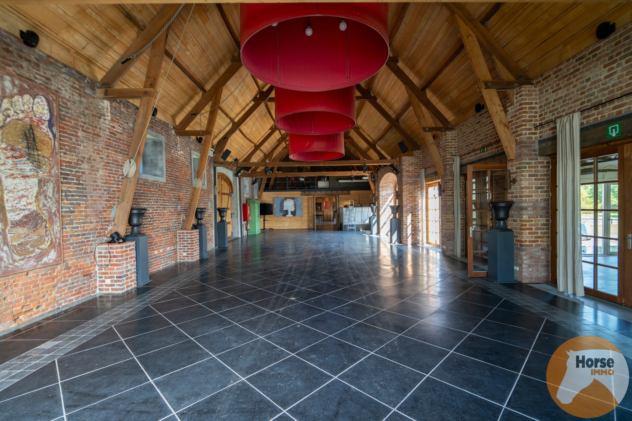 Ruime feestzaal met bijhorende keuken (geschikt voor externe catering) en een grote parking.